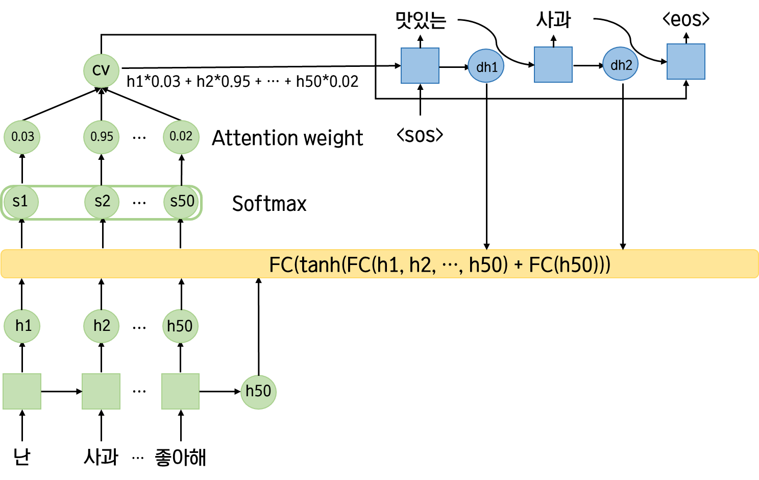 - 디코더에서 인코더의 정보를 참조할 때, 모든 정보를 동일하게 고려하는 것이 아니라, 중요한 정보에 가중치를 부여하는 방식을 사용하는 모델