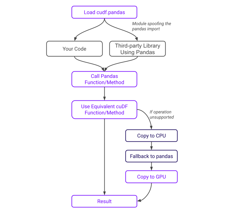 cudf.pandas를 사용할 때, cuDF의 pandas 호환 모드가 자동으로 활성화되어 pandas과의 일관성을 보장합니다.
