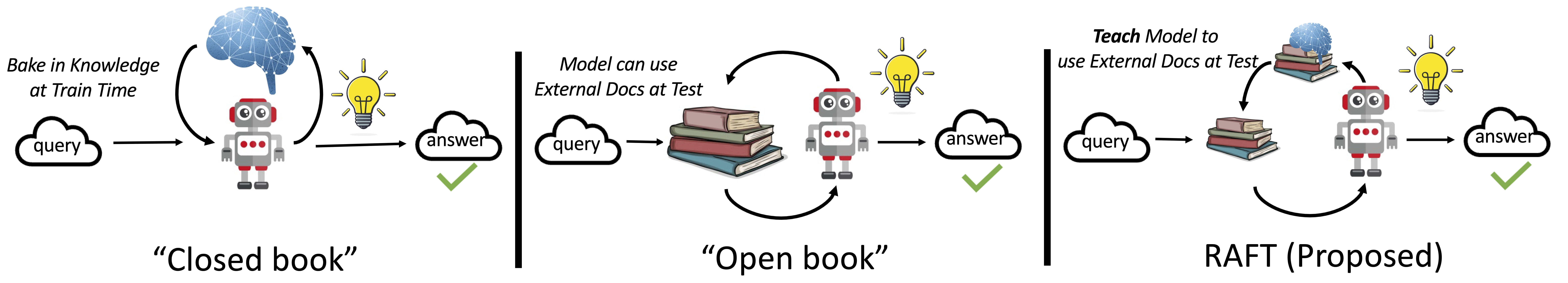 - RAFT는 특정 도메인의 "open book" 환경에서 질문에 답변하는 모델의 성능을 향상시키기 위해 설계된 훈련 전략으로, 선택된 문서를 기반하여 질의응답 작업을 위한 LLM의 파인튜닝 방안을 제시합니다.