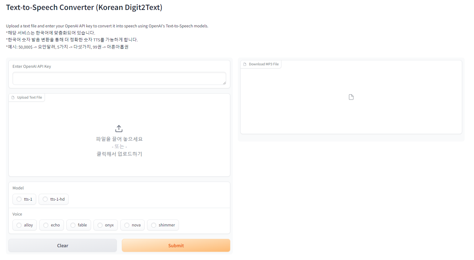 https://huggingface.co/spaces/Hyeonseo/Text-to-Speech-Korean_Digit2Text