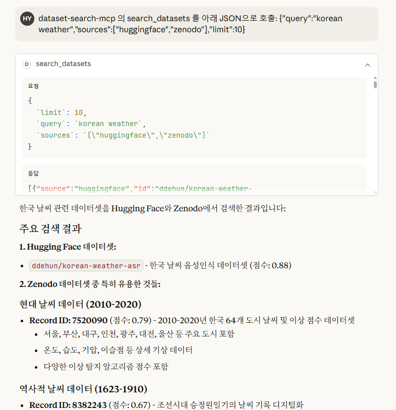 여러 공개 데이터 소스(Hugging Face, Zenodo, Kaggle 등)를 통합해 탐색할 수 있는 MCP 서버를 제공하는 것을 목표로 개발했습니다. 단순히 한 플랫폼에 국한되지 않고, 다양한 공개 데이터셋을 한 번에 검색할 수 있도록 설계했습니다.