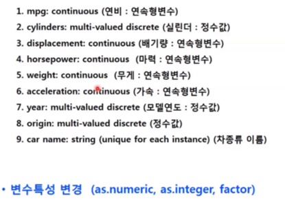 참고사이트 : http://archive.ics.uci.edu/ml/datasets/Auto+MPG