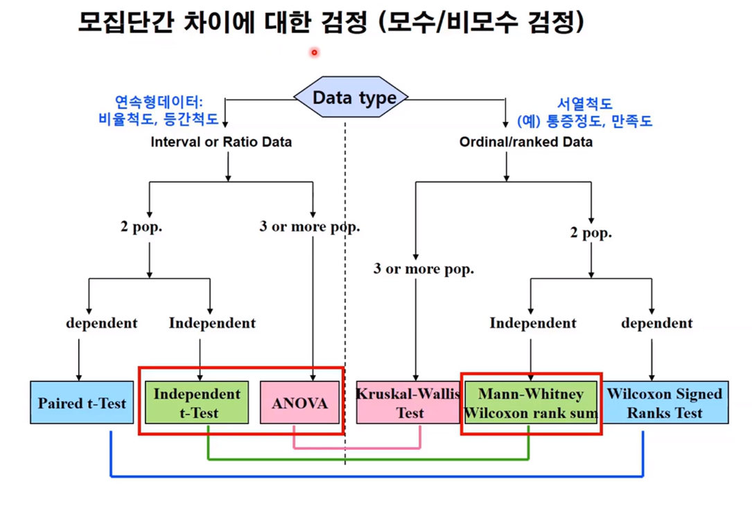 - 비모수 : 분포가 알려져있지 않을때 사용