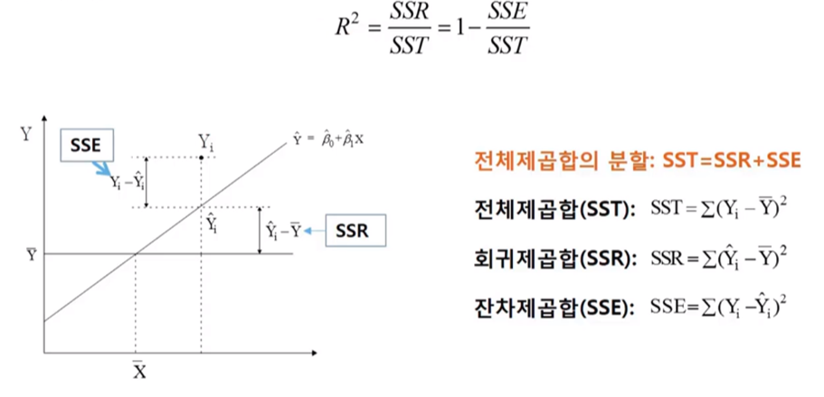 : 전체제곱합(SST)에 대한 회귀제곱합(SSR)의 비율, 즉 모형으로 설명할 수 있는 부분의 비율