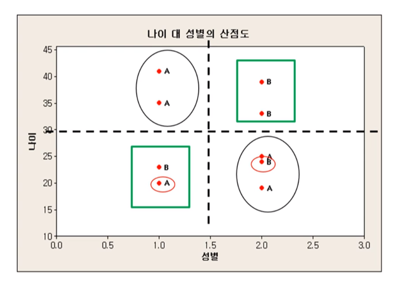 (분류규칙 2) [남자 & (Age>=30 or Age<=20) ] => 범주 1 (A)