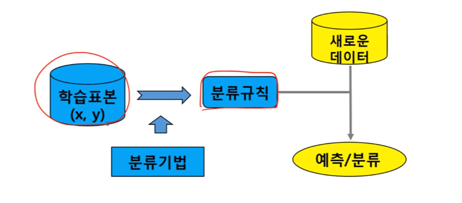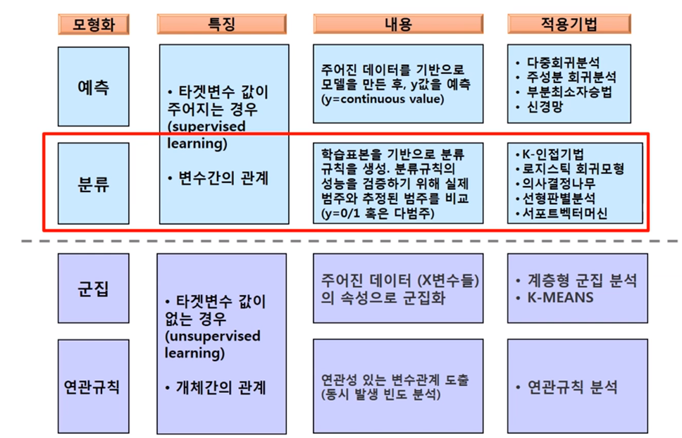 - 분류(Classification) - 지도학습(Supervised Learning). 타켓범주를 알고 있는 데이터로 분류규칙을 생성하고 새로운 데이터를 특정범주에 분류하는 기법
