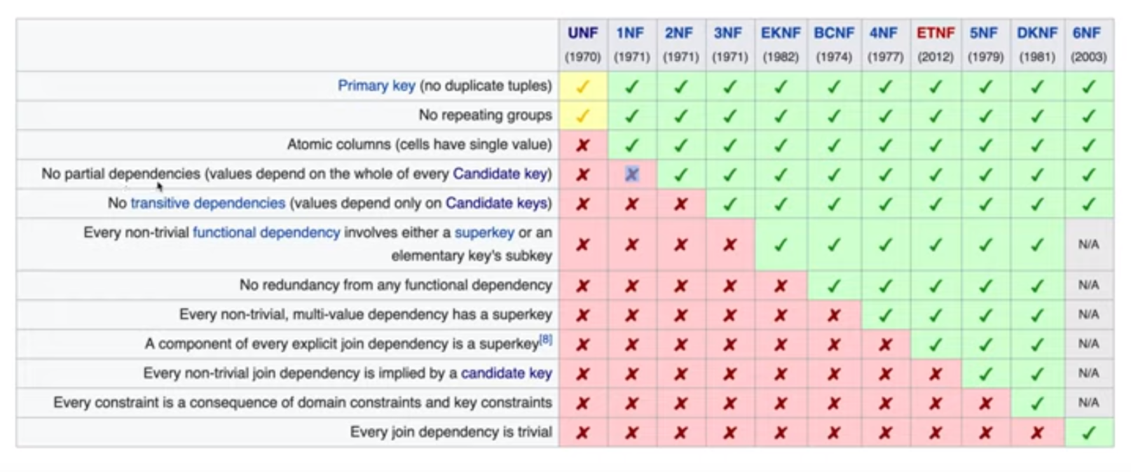 - No partial dependencies : 부분 종속성이 없어야됨(=표에서 중복키인 것이 없어야함)