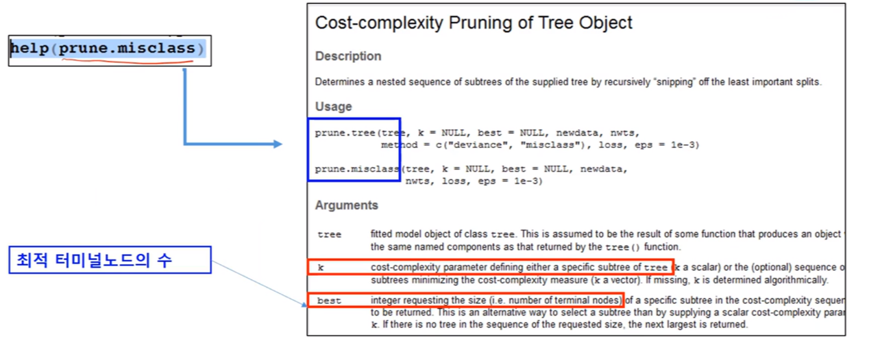 cv.tree함수에서 가지치기 함수는 prune.tree 혹은 prun.misclass를 사용할 수 있다.