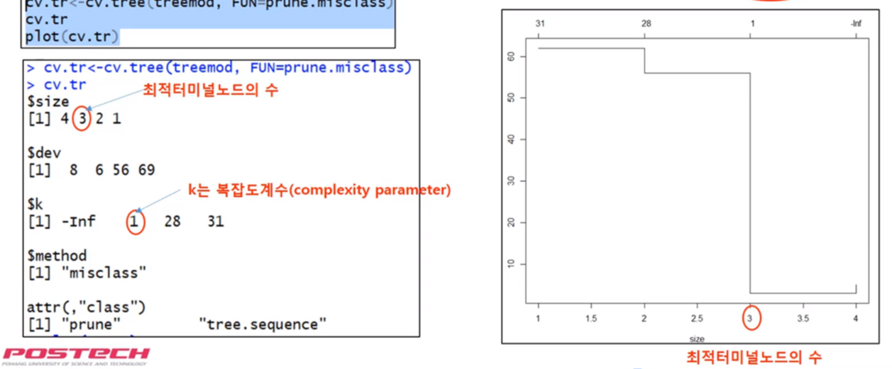 - 최적tree모형을 위한 가지치기(prunung) : cv.tree(tree모형결과, FUN= )
