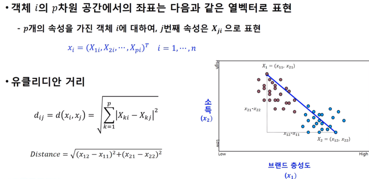 - 객체 간의 유사성 정도를 정량적으로 나타내기 위해서 척도가 필요