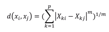 - 유클리디안 거리의 일반화된 방법 (m=2 일 때는 유클리디안 거리와 동일)