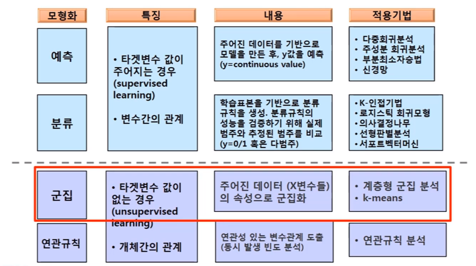 - 군집분석은 비지도학습(Unsupervised Learning) : 속성변수들의 특징으로 그룹화
