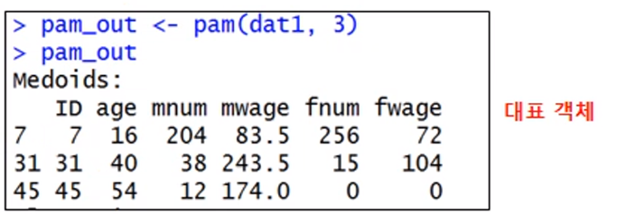 - 군집의 대표 객체란, 군집 내 다른 객체들과의 거리가 최소가 되는 객체