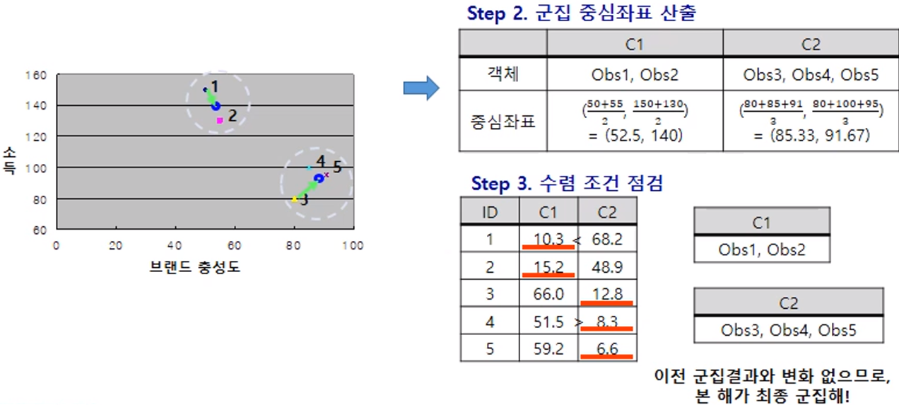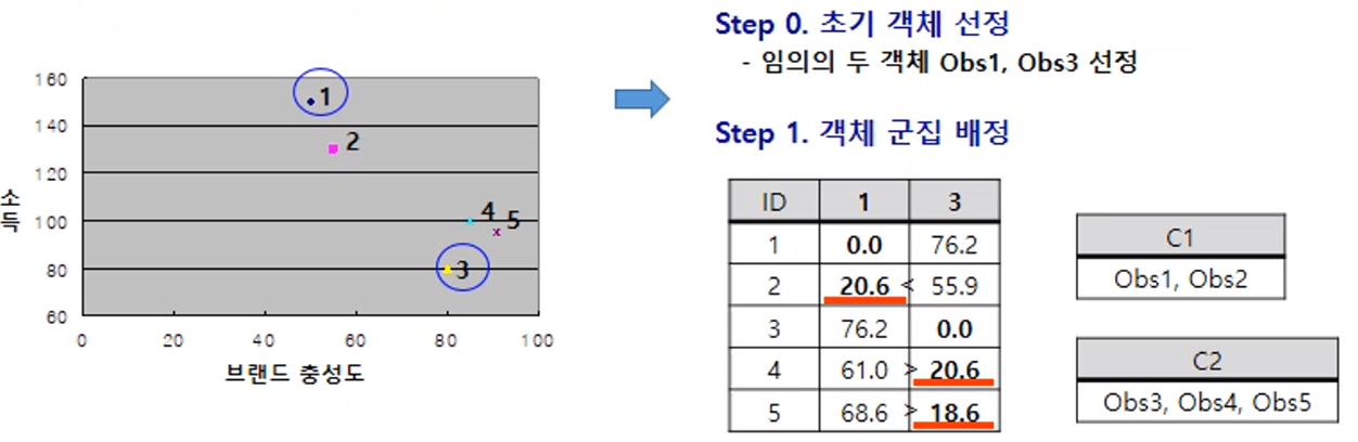 각 객체와 k개 중심좌표와의 거리 산출 후, 가장 가까운 군집에 객체 배정
