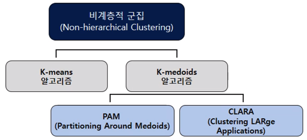- k-means 군집분석은 비계층적 군집분석 중 가장 널리 사용