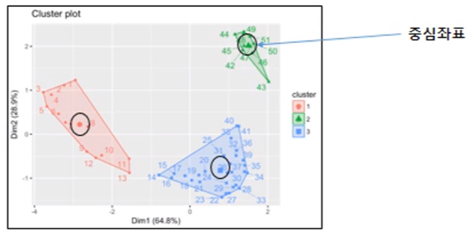 - 사전에 군집 수 k를 정한 후 각 객체를 k개 중 하나의 군집에 배정