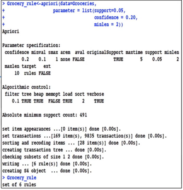 Grocery_rule<-apriori(data=Groceries, parameter = list(support=0.05, confidence = 0.20, minlen = 2))