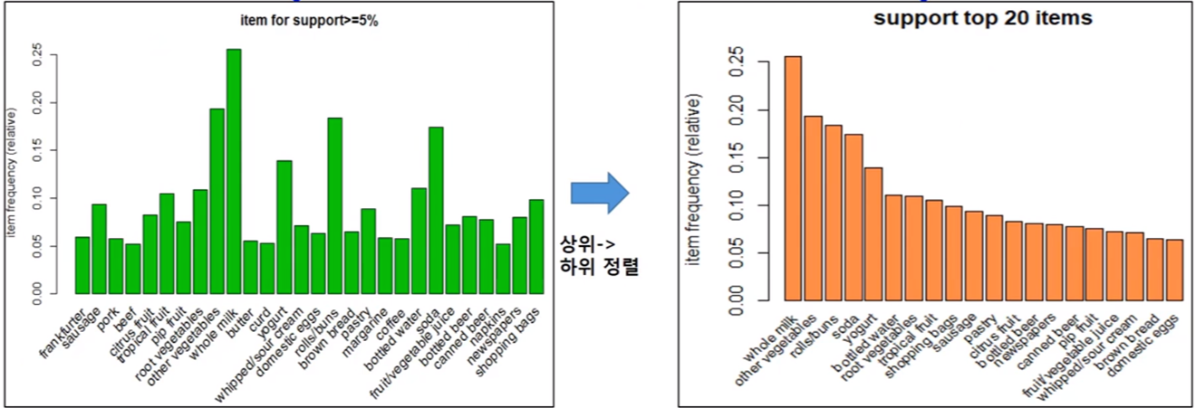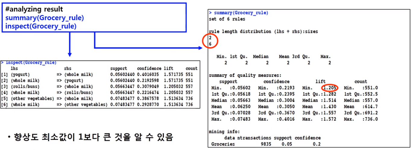 - 위의 support, confidence와 length는 minimum값으로 너무 높게 잡으면 연관규칙 분석이 안됨