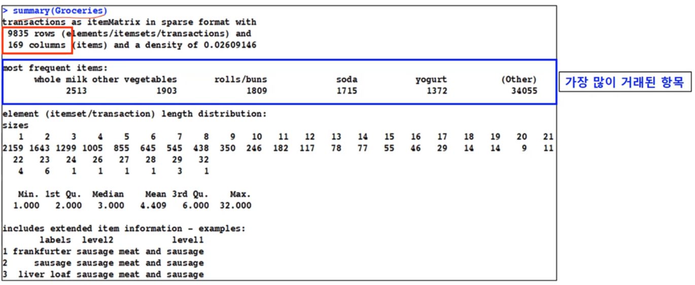 - Groceries (데이터이름, "arules"package에 탑재되있는 데이터)