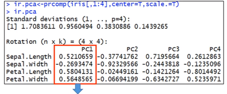 ir.pca<-prcomp(iris[,1:4],center=T,scale.=T)