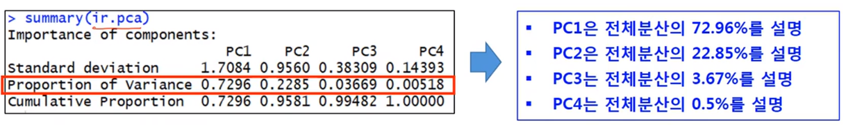 => 누적설명비율을 보면 PC1와 PC2, 두개의 성분으로 전체분산의 95.81%를 설명