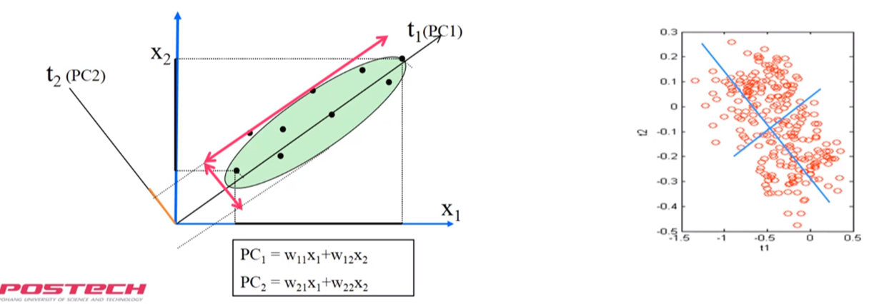 - '주성분'이라고 불리는 선형조합으로 표현하는 기법