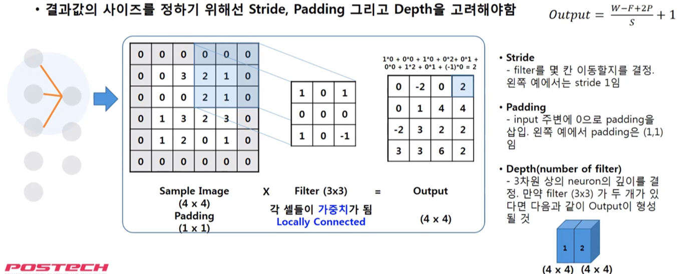 - 결과값의 사이즈를 정하기 위해선 Stride, Padding 그리고 Depth을 고려해야함