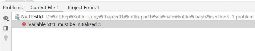 ▶ 코틀린의 변수 선언은 기본적으로 null을 허용하지 않는다.