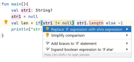 - str1?.length : str1이 null이면 length(뒷부분) 실행 X