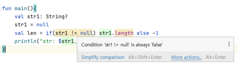 println("str: $str1, length: ${str1!!.length}")
